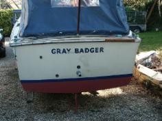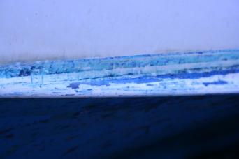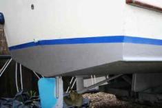 once sanded and smooth, silverguard primer is applied and a new blue waterline stripe